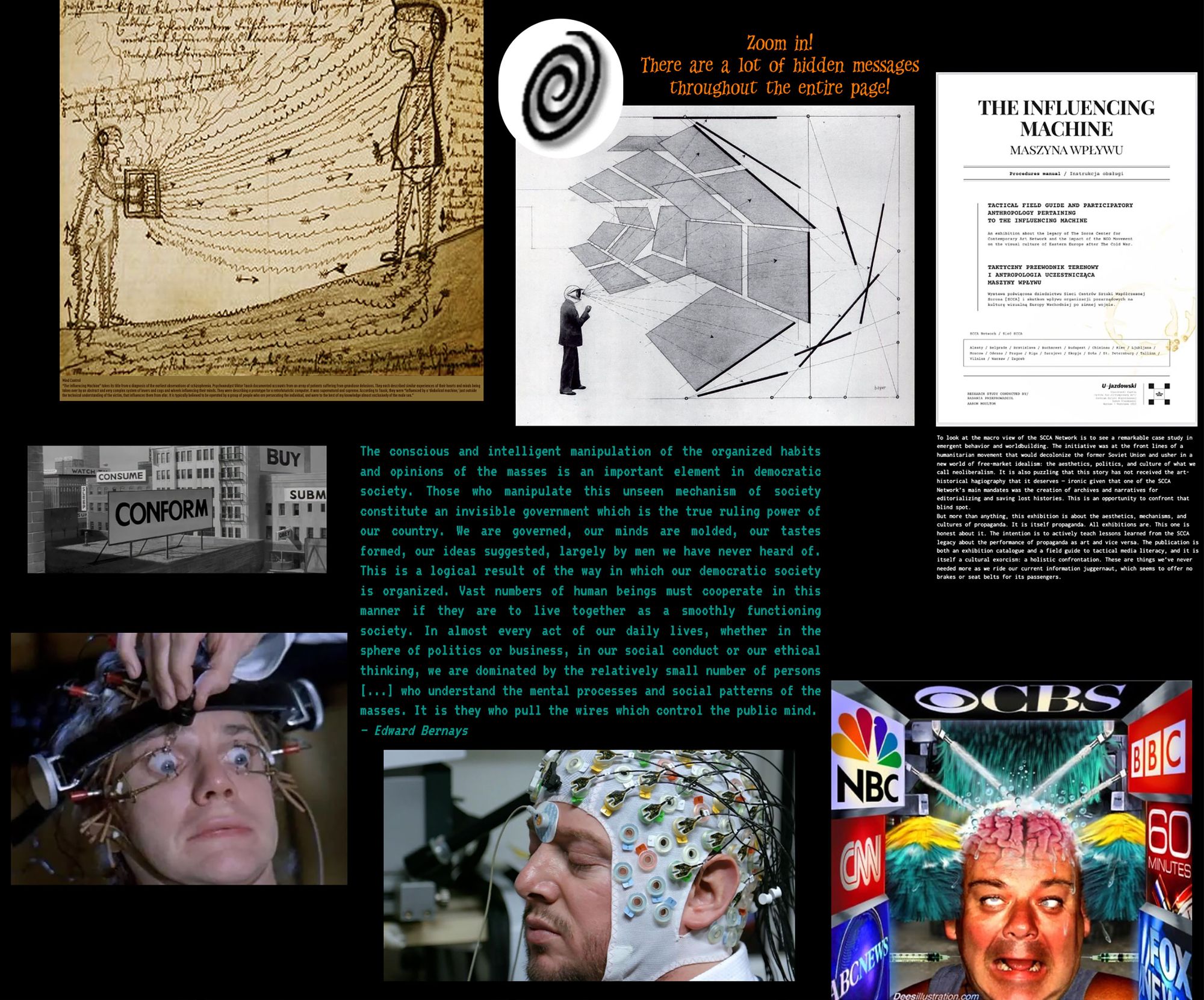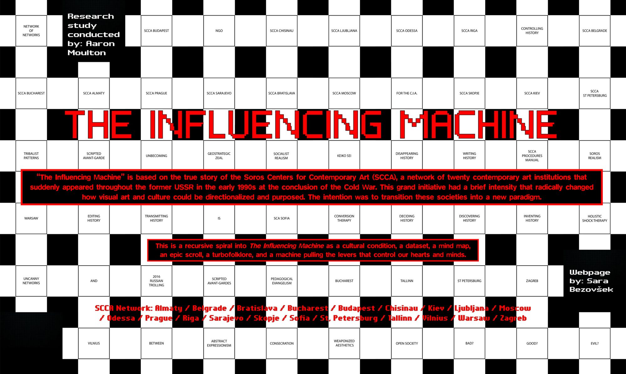 The Influencing Machine is a browser-based artwork by Slovenian artist Sara Bezovšek based on the true story of the Soros Centers for Contemporary Art (SCCA), a network of twenty contemporary art institutions that suddenly appeared throughout the former USSR in the early 1990s at the conclusion of the Cold War. This grand initiative had a brief intensity that radically changed how visual art and culture could be directionalized and purposed. As part of the research project and exhibition organized by Aaron Moulton under the same title, Bezovšek treats the Procedures Manual and the SCCA Network archive like a dataset, resulting in an all-encompassing recursive spiral into the Influencing Machine itself as a cultural phenomenon, a mind map, an epic scroll, a turbofolklore, and a machine pulling the levers that control our hearts and minds. This was initiated through a dialogue between artist Sara Bezovšek and Influencing Machine curator Aaron Moulton as a way to question the vulnerability of the archive as a portrait of reality and a way to turn the information surrounding this research into something sensory and emotional.